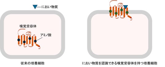 嗅覚受容体はアミノ酸が連なってできたタンパク質です。今回花王は、従来解析できなかったヒトの嗅覚受容体それぞれについて、培養細胞表面に存在できない原因となるアミノ酸を一つひとつ推定し、それを解決できると予測されるアミノ酸に置き換えました。その結果、ほぼすべての嗅覚受容体を培養細胞の表面に安定して発現させることに成功し、におい物質を認識できる状態を再現することができました(図1)。