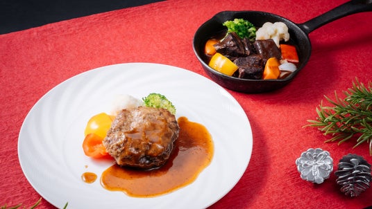牧草牛100%のハンバーグと、牧草牛の赤ワイン煮込みを各1個ずつセットにした、冬限定の特別ディナーセットをご用意しました。