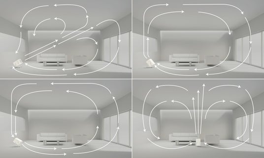 対角面へ空気を移動させている図(左上)・壁面に向けて壁伝いで空気を移動させている図(右上)・床面に向けて空気を移動させている図(左下)・部屋中心に垂直に空気を移動させている図(右下)