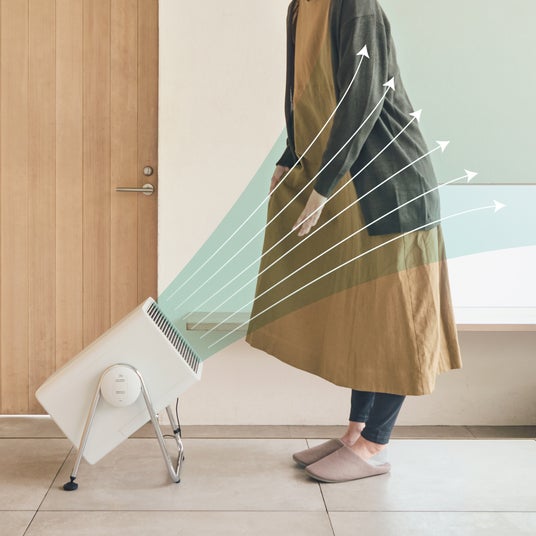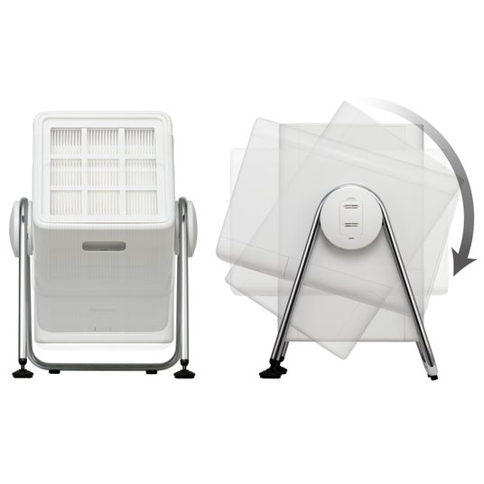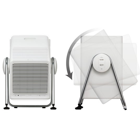 床から浮き上がった底面から吸い込まれた空気は、3層のフィルターを経由して汚れや臭いを除去された状態で吹き出されます。さらにその方向はフレキシブルに調節でき、花粉を付けて帰ってきた身体に、玄関先で空気シャワーを浴びせるような使い方も。