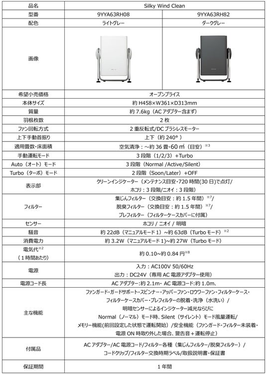 外装色は何処の部屋にも合わせやすいスタンダードなライトグレーとダークグレーを採用。発売中のハンディファン、ミニファン、サーキュレーターの「Silky Wind」シリーズ製品と同色の統一感のある配色展開です。