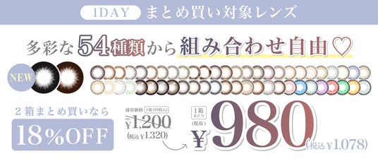 TeAmo 1DAYでは、シーンに合わせて使い分けできる新色含む全54種類のレンズをご用意しております。学校や職場で使いやすいシンプルなサークルタイプや自然に可愛く盛れるナチュラルタイプのカラーコンタクトレンズなどを多数取り揃えている他、ナチュラルハーフタイプ、ハーフタイプ、高発色タイプまで、どんなジャンルでも“欲しい”が見つかる充実したラインナップをご提供しております。
