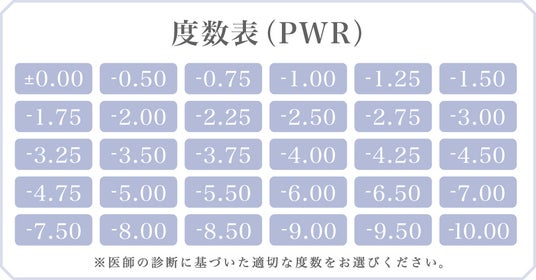 ■度数(PWR):±0.00(度なし) / -0.50~-5.00(0.25ステップ) / -5.50~-10.00(0.50ステップ)