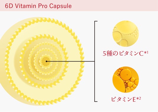 【6つのビタミン*²をカプセル化 6D Vitamin Pro Capsule】一般的には、酸化しやすく壊れやすいと言われるビタミンを安定的に肌に届けるため、主役成分である5種のビタミンC、1種のビタミンEを「6D Vitamin Pro Capsule」というカプセル化処方にしました。