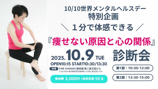 このイベントは、10月10日の「世界メンタルヘルスデー」を記念し、日本のダイエット失敗率95%という深刻な課題に対し、従来の食事制限・運動療法とは根本的に異なる「メンタル×身体診断」アプローチによる解決法を、一般の方及び記者の皆様に実際に体験いただく機会を提供するものです。