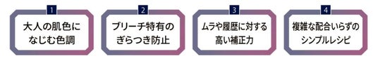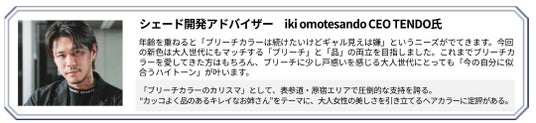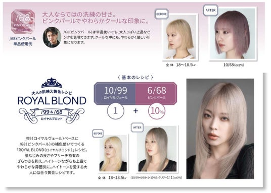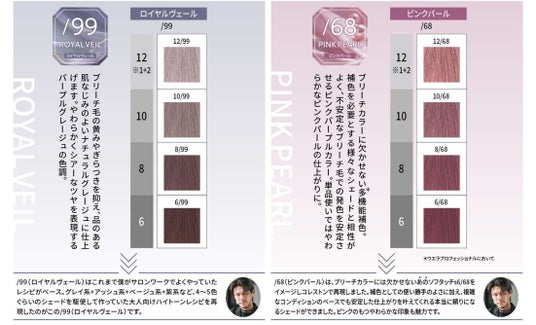 ウエラの調査*²によると、20代後半から30代にかけて「若い頃の服装やメイク、ヘアカラーが似合わなくなった」と感じる女性が急激に増加することがわかりました。同時にこの年代は「若いころと比べて肌がくすんで透明感がなくなった」とも感じており、年齢を重ねたことによる肌トーンの変化によって、今までのヘアスタイルに違和感を感じ始める世代でもあるようです。一方で、こうした肌印象の「若さから大人への転換期」を経てもなお、この世代でヘアカラーをしている方の69%*³が「年齢を気にせず好きなヘアカラーやデザインを続けたい」とも考えていることがわかりました。ウエラはこの「若さから大人への転換期」に当たる20代後半から30代女性のヘアカラーへのジレンマに着目。「ブリーチカラーのカリスマ」として大人女性の美しさを引き立てるヘアカラーに定評があるiki omotesando CEO TENDO氏をシェード開発アドバイザーに迎え、今回の2色が誕生しました。「ロイヤルヴェール」はブリーチ毛の黄みやぎらつきを抑え、品のある肌なじみのよいナチュラルグレージュを表現、「ピンクパール」はブリーチカラーに欠かせない多機能補色*⁴として様々なシェードと相性が良く、さらに不安定なブリーチ毛での発色を安定させるピンクパープルカラーです。
