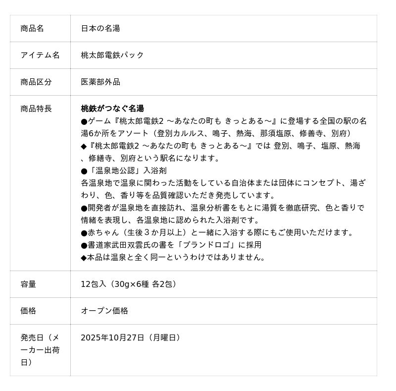 本品は、開発者が実際に温泉地を訪れて湯ざわりを体感し、さらに温泉分析書を基に成分データを収集。入浴剤に適した成分で上位3成分を選び、実際の温泉にできるだけ近い比率で処方することにもこだわった温泉タイプ入浴剤です。また、香りや色も追求し、その温泉地に訪れたような情緒感も大切にしています。本品では、ゲーム『桃太郎電鉄2 ~あなたの町も きっとある~』に登場する全国の駅の名湯6か所をアソート(登別カルルス、鳴子、熱海、那須塩原、修善寺、別府)にしています。さらに、今回のコラボレーションに合わせて、本シリーズ既存アイテムの「桃太郎電鉄」デザインの数量限定企画品を10月より順次発売予定です。