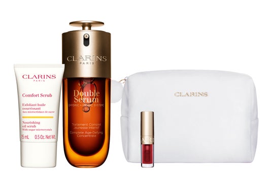 今年誕生40周年を迎えた、クラランスを代表する人気のエイジングケア* 美容液「ダブル セーラム ADC」の現品に、唇の角質ケアとしても使用できる「コンフォート オイル スクラブ」、うるおいとツヤを与える「リップコンフォートオイル 03」のミニサイズをセットに。