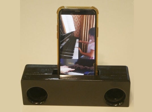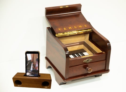 スマートフォンで聴けるように音源データを作るため、お客様のピアノの部材を使って「木製スマホスタンド」も作製します。木のぬくもりが感じられるスピーカーの役割もあり、お家の中だけでなく、山や海に出かける時など、自分の大切なピアノの面影を持ち歩くこともできるようになります。