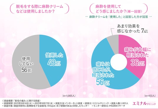 「脱毛をする際に麻酔クリームなどは使用しましたか?」と質問したところ、約4割が『使用した(43.1%)』と回答しました。