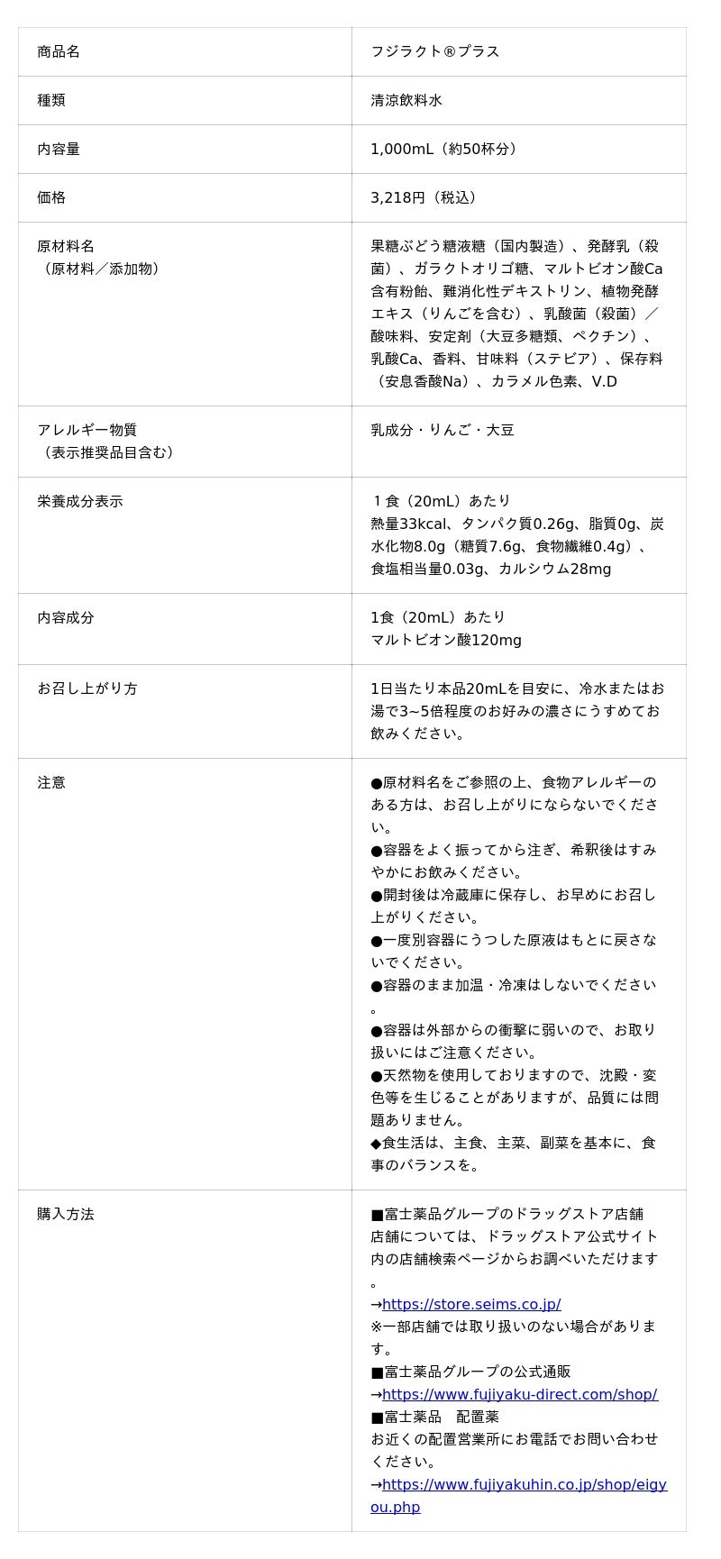今回のリニューアルでは、従来の美味しさはそのままに、新たにカルシウムなどの成分を配合しました。フジラクト(R)プラスは富士薬品の配置薬販売および、「セイムス」をはじめとする富士薬品グループのドラッグストア、富士薬品公式通販でご購入いただけます。