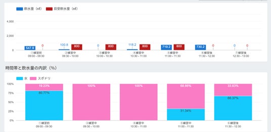 (発汗量予測に基づいた飲水計画の提案と、リアルタイム飲水モニタリングの一例)