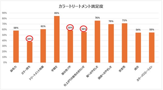 ・ 「仕上がりの髪色のキレイさ」への満足度は56%に留まり、カラー持ち(38%)や髪の色つや(58%)といったカラートリートメントの基本的な機能や性能に対する不満が多いことがわかりました。