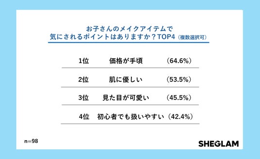 「お子さんのメイクアイテムで気にされるポイントはありますか?」という質問では、「価格が手頃」(64.6%)が最多で、次いで「肌に優しい」(53.5%)、「見た目が可愛い」(45.5%)、「初心者でも扱いやすい」(42.4%)という結果になりました。