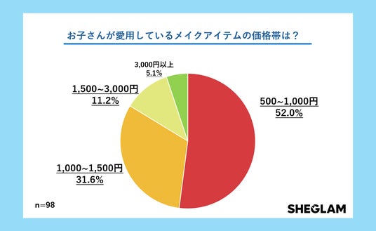 「お子さんが愛用しているメイクアイテムの価格帯は?」では、「500~1,000円」(52.0%)が最多となり、続いて「1,000~1,500円」(31.6%)が多いという結果となりました。全体の8割以上が1,500円以下という結果から、手に取りやすい価格帯のアイテムがメイクデビューの中心となっていることがわかります。