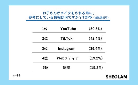 「お子さんがメイクをされる時に、参考にしている情報は何ですか?」という質問では、「YouTube」(50.5%)、「TikTok」(42.4%)、「Instagram」(39.4%)が上位を占めました。一方で「雑誌」(15.2%)や「Webメディア」(19.2%)は回答が2割に満たず、情報源としては動画SNSの存在感が際立つ結果となりました。その中でも「YouTube」と「TikTok」が高い支持を集めており、じっくり学べる長尺動画と、トレンドを手軽にチェックできる短尺動画の両方が活用されている様子が見て取れます。