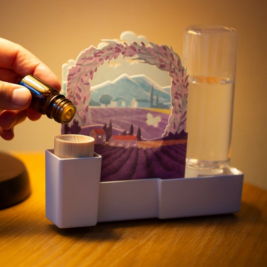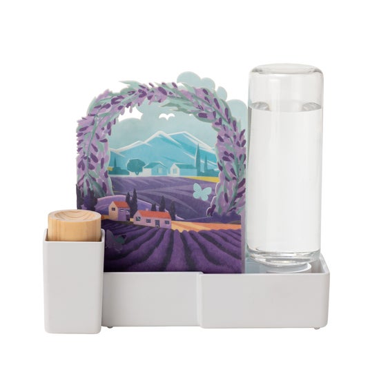 ラベンダー畑とリースをイメージしたデザインの自然気化式加湿器。給水ボトル付きで水を入れる手間を軽減し、上部のくぼみにアロマオイルを垂らして香りを楽しむヒノキ製のアロマディッシュ付き。