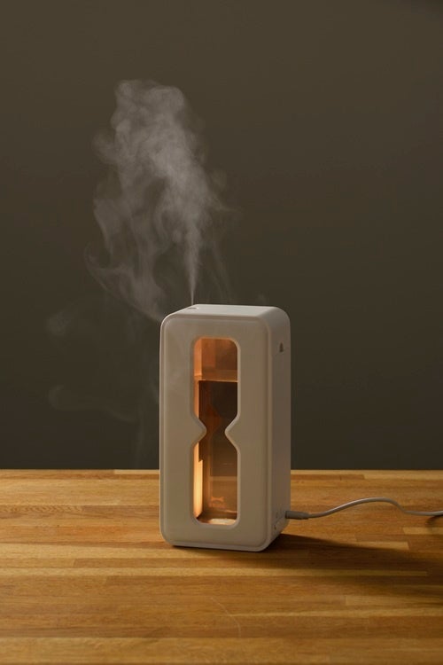 砂時計型の窓から水の残量を確認できるデザイン。ライト付きでアロマウォーターにも対応。