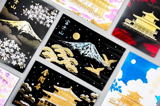箔押し加工とは熱と圧力によって、紙に箔を圧着させる技法です。浮世絵の木版画を刷り上げていくように、1枚ずつ金属板をつくり、2度3度と箔を重ねて絵柄を完成させていきます。
