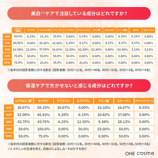 【美白(*)ケアで注目している成分はどれですか?/保湿ケアで欠かせないと感じる成分はどれですか?】