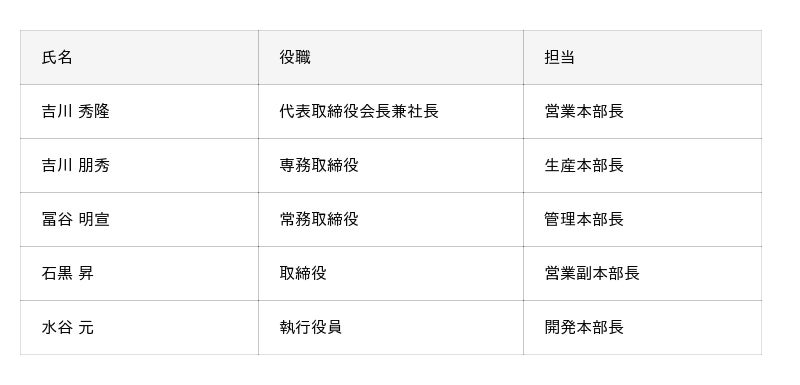 代表者 :代表取締役会長 兼 社長 吉川 秀隆