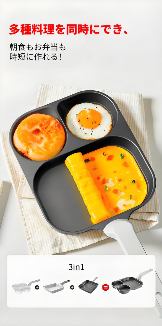 「朝は時間がない…でも栄養たっぷりの朝食を食べたい!」そんな方にこそ、この 3-in-1 分区フライパン がおすすめ!