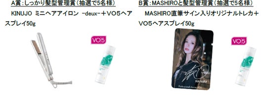 期間中、VO5公式Xアカウント(@VO5_japan)をフォローし、公式投稿を引用リポストするだけで、「髪型管理」応援アイテムが抽選で当たるキャンペーンに応募いただけます。また、MASHIROさんコラボミニヘアスプレイ(20g)付き限定品も同時販売し、この秋冬のイベントシーンの髪型管理をサポートします。