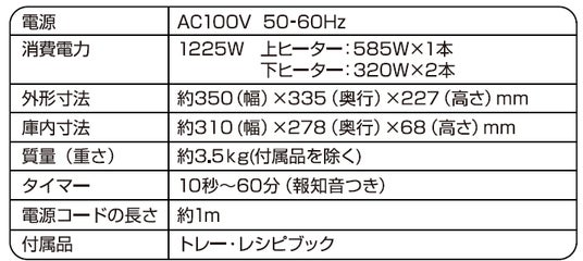 オートメニュー:トースト(1枚・2~4枚焼き)・冷凍トースト(1枚・2~4枚焼き)、調理トースト、リベイク、冷凍リベイク