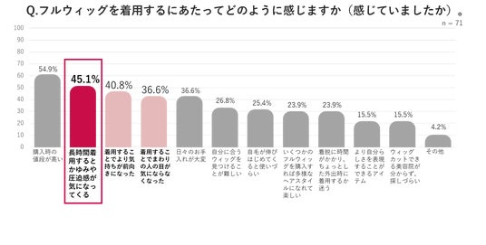 本プログラムでウィッグ使用経験者を対象に独自に行ったウィッグ使用にまつわる調査(※1)でも、フルウィッグに関して「着用することで気持ちが前向きになった」「着用することで周りの人の目が気にならなくなった」といった前向きな回答が寄せられる一方で、「購入時の値段が高い」、「長時間着用するとかゆみや圧迫感が気になってくる」と感じている方の割合も多く、フルウィッグを着用する場合でも、様々な悩みが存在していることが分かります。