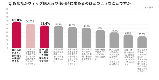 フルウィッグに限らず、ウィッグ購入時や使用時に求めることとしても、「付け心地がよく、長時間でも快適に使える」、「より手ごろな価格で長く使用できるウィッグが購入できるようになってほしい」、「自分で簡単に着脱したり調整したりできるか」といった選択肢に最も回答が挙げられ、ウィッグを着用するにあたっては購入時の費用のほか、「長時間使える着け心地」と「着脱のしやすさ」が重要視されています。
