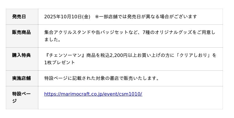 株式会社マリモクラフト(本社:東京都江東区)は、発行部数3,100万部突破の大人気コミック『チェンソーマン』の劇場版『チェンソーマン レゼ篇』公開を記念して、2025年10月10日(金)より書店限定グッズフェア「CHAINSAW MAN BOOK STORE」を対象書店にて開催いたします。アクリルスタンドや缶バッジセットなど、7種の書店限定アイテムをご用意しました。さらにお買い上げ特典として、税込2,200円以上ご購入いただいた方に、デンジやレゼたち6人がデザインされた「クリアしおり」を1枚プレゼントいたします。