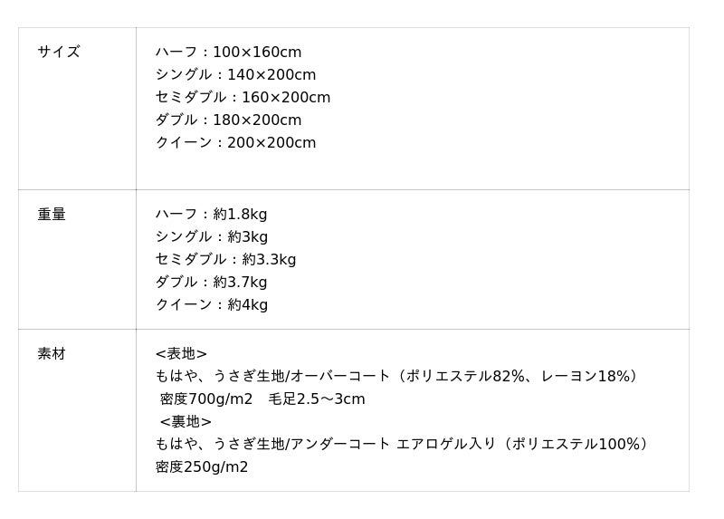 表地には、湿気を吸収して熱に変える吸湿発熱素材を採用しており、うさぎの上毛のようにふんわりと身体を包み込みます。裏地には、高い断熱性能をもつ【エアロゲル】を配合し、外気の冷たさを遮断して布団内の熱を逃さずキープします。この2枚合わせ構造によって自然な空気の層が生まれ、軽やかなのにしっかりとあたたかい、包み込まれるような心地よさを実現しました。