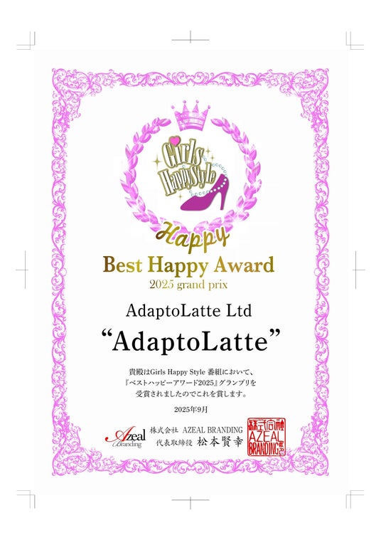 イギリス発のマッシュルームコーヒーブランドであり、日本で最初かつ最大級のマッシュルームコーヒーブランド「アダプトラテ」(AdaptoLatte ltd / 代表 阿部翔音、ソフィー・レーン)は、地上波TV番組『東京女神コレクション ガールズハッピースタイル』にてご紹介され、ベストスマイルアワード2025グランプリを受賞しました。