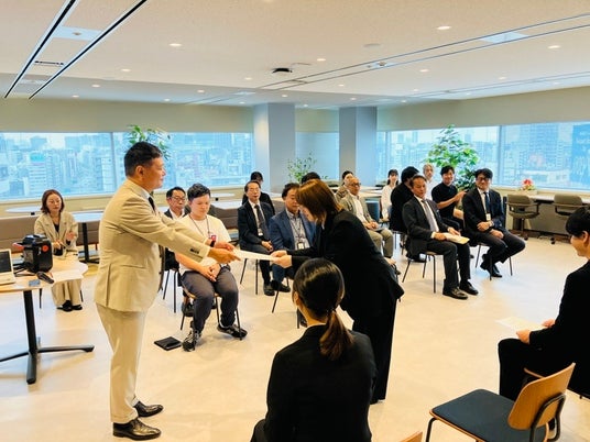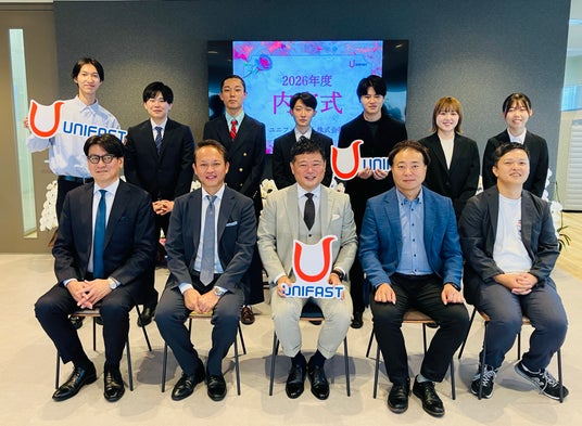 雑貨等ものづくりに関する企画やプロモーション支援に関するSP業務を手がけるユニファースト株式会社(本社:東京都墨田区、代表取締役社長:橋本敦)は、2025年10月1日、新本社オフィス(両国シティコア12階)にて、2026年入社予定の新卒内定者7名を迎えて「2026年度内定式」を実施しました。移転後の新オフィス内にある象徴的な空間「スカイラウンジ」で初めて開催されたこの式典では、社員と内定者がより近い距離で交流し、自分らしく働ける環境を体感できるプログラムを実施しました。