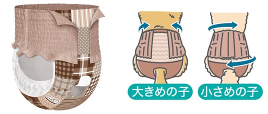 ・伸縮アジャスター構造でズレにくい、日本で唯一のパンツタイプのおむつです。