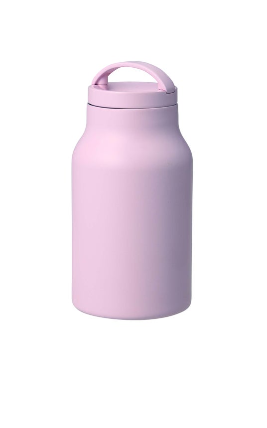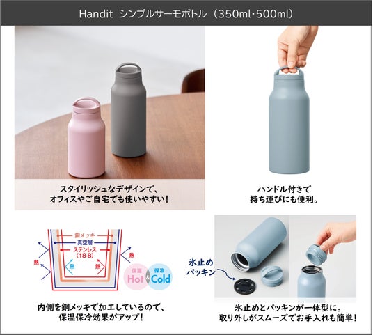 「Handit シンプルサーモボトル」は、機能性とデザイン性を兼ね備えた商品です。ステンレスボトルは持ち運びに便利なアイテムですが、手から滑り落としやすい面もあり、本体が傷ついてしまうことがあります。そこで蓋にハンドルを付けると共に、蓋の上部も窪ませることで持ち運びしやすく、コンパクトでスタイリッシュなデザインを実現しています。