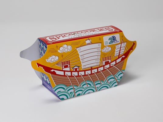 これにヒントを得て製作したのが、遣唐使船の形の箱に入ったシナモン風味のスパイスクッキーです。箱デザインは九州国立博物館監修で、遣唐使船の最新研究に基づき8~9世紀ごろの姿を反映しています。一見、版ずれしているかのように見えるレトロ調のタッチにし、雲には「989(九博)」の隠れ文字をあしらい、側面は九州国立博物館のロゴと同じカラーリングに整えました。クッキーは香辛料が強すぎると好き嫌いがでてしまうので、程よい風味を求めて試食を重ねました。遣唐使が活躍した時代を身近に感じ、東アジアの中の日本という視野を養う、学びのお供に最適なクッキーです。