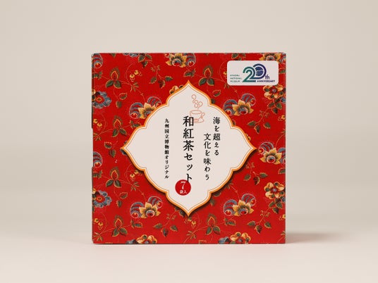 中に入るのは、福岡県八女の八女和紅茶。海外産の紅茶ではなく、九州国立博物館のある福岡県の地場産の和紅茶にしました。紅茶に最適とされる希少品種の「べにふうき」を2回発酵させて90日間熟成させた、深い旨みのある、渋味の少ない飲みやすい和紅茶です。