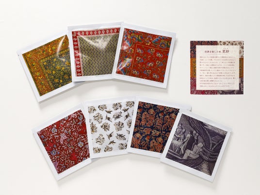 カードのように更紗の美しさを眺めて欲しいという思いで選んだ個包装の7柄と解説パンフレット