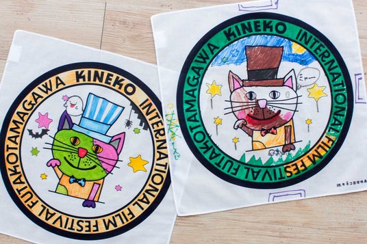 今回のワークショップのためにキネコ国際映画祭オリジナルのハンカチを作成しました。ハンカチの裏面には、名前が書けるネームタグ付き。色を塗ったり絵を描き加えたり。世界にひとつだけのハンカチーフをお作りいただけます。お子様はもちろん大人もお楽しみいただけます。