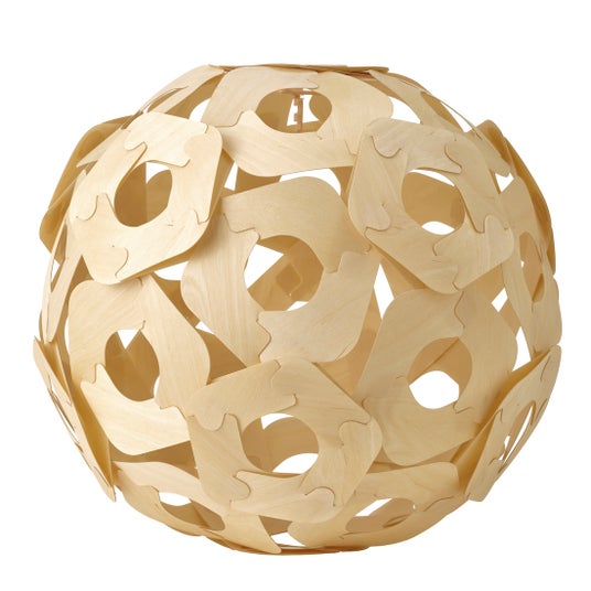 また、直径48cmにもなるランプ全体の球形は、独自の幾何学的なデザインが特徴であり、その大胆な構造がランプ全体の球形を保ちながら、組み立てる楽しさも提供します。このランプシェードが持つすべての特徴がアイテム自体を輝かせ、ランプを点灯すると、シェードが表情を変え、突き板越しに柔らかく落ち着いた光を放ちます。