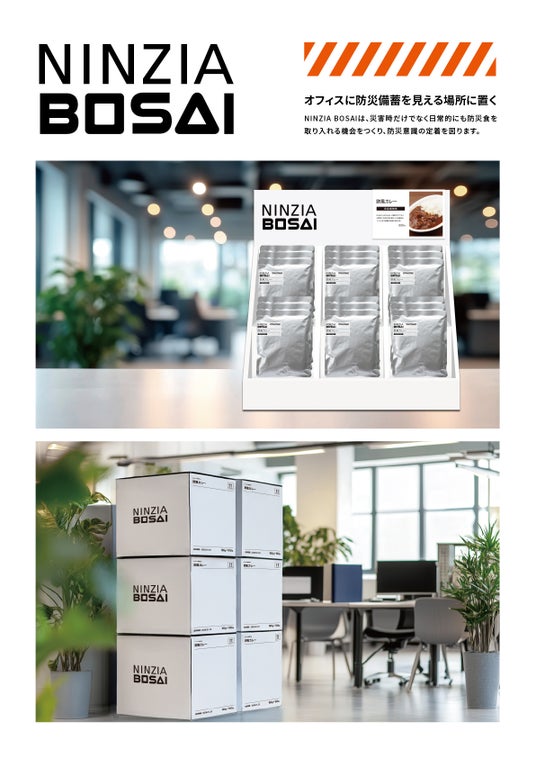 近年、ESG/BCP強化が推進される一方、自治体の全備蓄量の4分の1が消費期限切れで廃棄されているとも言われ、防災食の「隠れ食品ロス」が社会課題になりつつあります。NINZIAが防災の日に実施した調査(対象:300名)では、防災食のイメージについて「防災食は美味しくない」と回答した人が49%、「賞味期限の管理が大変」と答えた人が53%に上りました(複数回答可)。さらに企業の備蓄場所については、「知らない」が40%、「備えていない」が35%と、防災体制の実効性にも課題が見られました。こうした現状を受け、NINZIA「見せる・味わう・植物性」をテーマに、持続可能な備蓄システム 『NINZIA BOSAI』を立ち上げました。災害時のみならず、普段の食事にも取り入れられる「フェーズフリー食品」をラインナップ。動物性油脂を使わず、完全植物性にすることで常温でも脂が固まらず、防災に求められる機能と満足感ある味わいの両立を実現しました。『見せる防災食』としてオフィスに設置することで、日常的には社食・学食として活用でき、自然なローリングストックを促進。加えて、全社員が備蓄場所を把握できる体制を構築することで、災害時にも迅速な対応を可能にし、備蓄不足によるリスクの最小化を目指します。