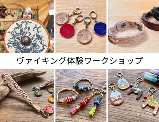 盾や兜でヴァイキングになったり、ものづくりに挑戦したり。ヴァイキングをテーマにした手づくりのアクセサリーと革製品の販売もあります。