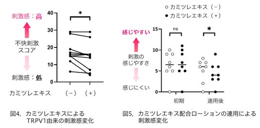 TRPV1活性化剤による不快刺激に対して、感受性の高い被験者を選定し、TRPV1活性化剤と特定の成分が含まれたカミツレエキスを配合したモデルローションを塗布したところ、カミツレエキスを含まない場合と比較し、TRPV1活性化剤による不快刺激が有意に低下しました(図4)。これにより、同成分がヒトにおいてもTRPV1アンタゴニスト※3として作用することが確認できました。