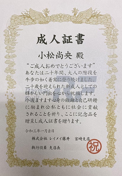 ・エピソード賞:大人部門 ~成人証書~コロナ禍で成人式に参加できなかった後輩のために、先輩社員が贈った手づくりの賞状。