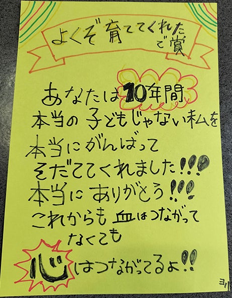 ・エピソード賞:子ども部門 ~よくぞ育ててくれたで賞~10歳の娘が母親に感謝を込めて贈った、血のつながりを超えた絆が表れた感動的な賞状。