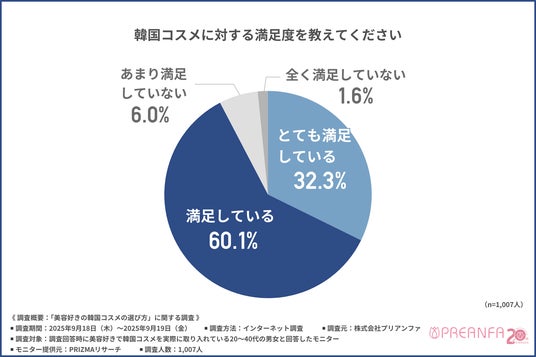 「韓国コスメに対する満足度」を尋ねたところ、約9割が『とても満足している(32.3%)』『満足している(60.1%)』と回答しました。