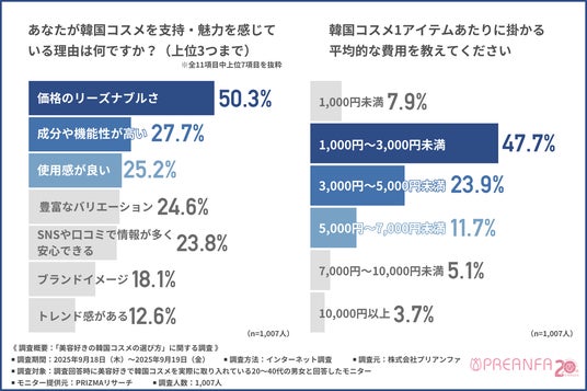 また、韓国コスメに魅力を感じている理由として最も多く挙げられたのは「リーズナブルな価格」で、これは1アイテムあたりの費用が「1,000~3,000円未満」に集中しているという結果とも一致します。