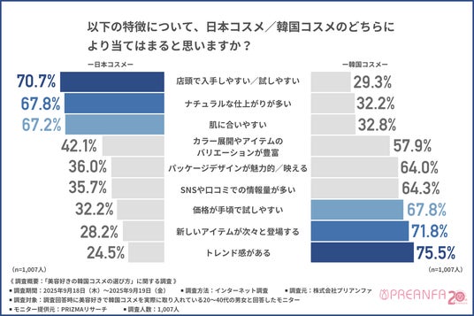 さらに、日本コスメとの比較では、韓国コスメが「トレンド感」「新商品展開」「SNSでの情報量」などで圧倒的な優位を示す一方、「店頭での試しやすさ」「ナチュラルな仕上がり」「肌になじみやすい」といった点では日本コスメが上回る結果となりました。