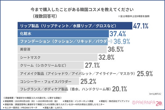 「今まで購入したことがある韓国コスメ」について尋ねたところ、『リップ製品(リップティント/水膜リップ/グロスなど)(47.1%)』が最も多く、『化粧水(37.4%)』『ファンデーション(クッション/リキッド/パウダー)(36.9%)』となりました。